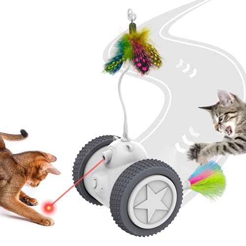Potaroma Cat Laser Toys Interactive 3in1, Rechargeable, Automatic Moving Wheels, 2 Feathers, Indoor Kitten Exercise Kicker Toys, Assorted Colors Feathers for All Breeds
