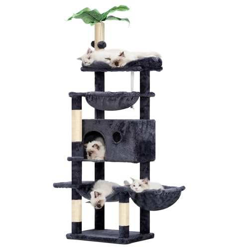 Hey-brother Cat Tree, 59 inches Cat Tower for Indoor Cats, Large Cat Condo with Top Perches, Double Basket, Leaf, Hammocks, Multi-Level Plush Modern Furniture Scratching Posts, Smoky Gray MPJ052G