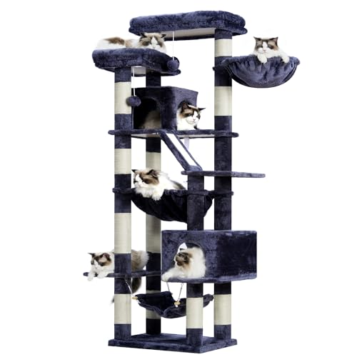 Heybly Cat Tree,71-Inch Tall Tower for Indoor Cats with 2 Perches, 2 Big Condos, 2 Hammocks, Basket, Scratching Pad,Large Cat Furniture and Condo, Smoky Gray HCT034G
