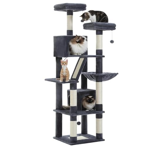Tall Cat Tree 70.9″, Large Cat Tower for Indoor Cats, Multi-Level Plush Cat Condo with 6 Scratching Posts, 2 Scratching Boards, 2 Perches, 2 Caves, Hammock, 2 Pompoms, Dark Gray