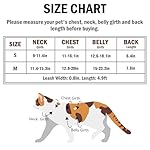 [Size Guide] – [S: Neck girth 9-11.4in, Chest girth 11-16.1in, Belly girth 12.6-18.1in, Back Length 6.4in]; [M: Neck girth 11.4-15.3in, Chest girth 12.8-20in, Belly girth 15-23.2in, Back Length 7.6in]. The length of both leashes is 4.9ft.